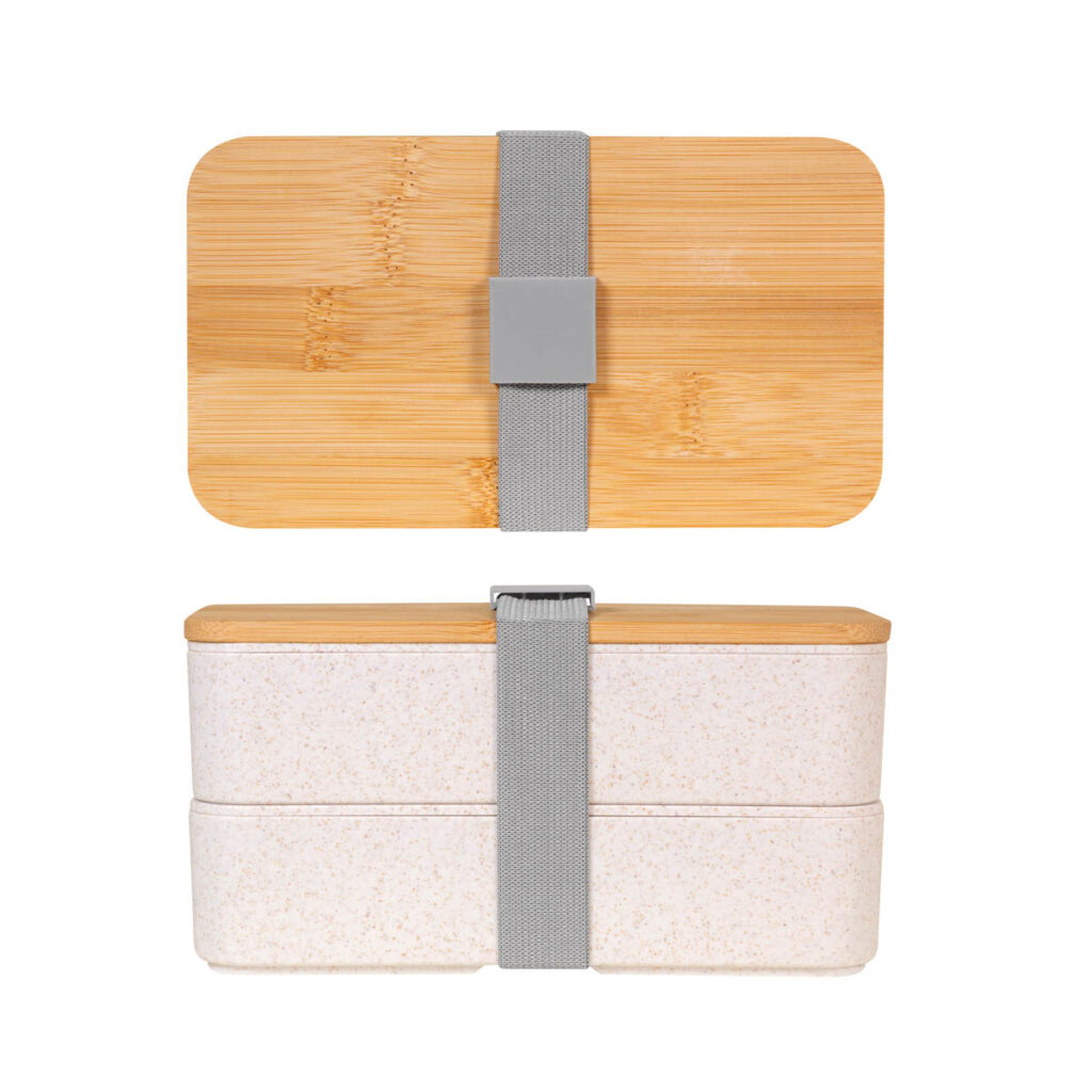 Contenedor de alimentos con doble compartimento. Capacidad total de 1 litro. Incluye tenedor, cuchillo y cuchara. Su fabricación lo hace amigable con el medio ambiente, al incorporar fibra de Trigo en sus materiales. La elegante Tapa de bambú asegura tus alimentos y la banda elástica mantiene todo firmemente cerrado. Práctico y versátil, este set es apto para lavavajillas y microondas, excluyendo la Tapa de bambú. La madera es un producto natural el cual puede presentar variaciones en tonalidades y vetas.